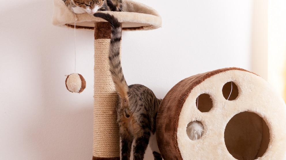 Two cats are lying on the scratching post. The one on top is dozing comfortably on its platform, its tail dangling loosely and swaying back and forth. The cat below watches for a while—becoming increasingly attentive—and eventually bites. The cat on top jumps up in surprise, feeling either confused or briefly annoyed. Does the biter know that the tail belongs to the other? PETBOOK editors Saskia Schneider and Louisa Stoeffler share their insights.
